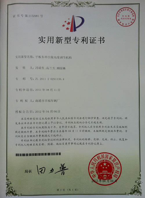 平板車牽引架高度調(diào)節(jié)機(jī)構(gòu)專利證書